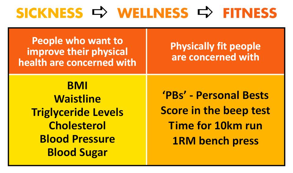 Unfortunately for quite a few of us who do physical training, we are generally not very fit or healthy. We may have high cholesterol, and other health related problems, recurring injuries, low cardiovascular fitness, no power, strength, flexibility nor agility.
